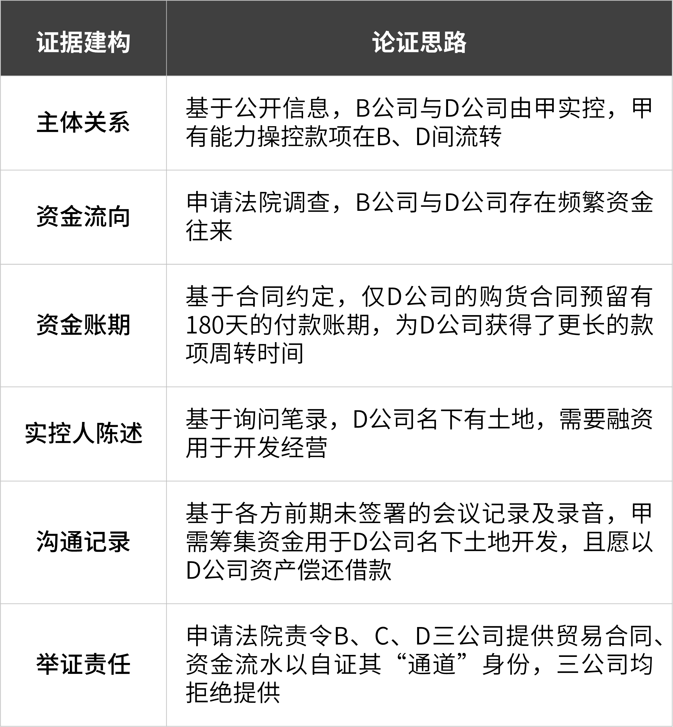 回到本文开头的案件,从交易模式、交易价格与各方陈述看,B公司自认借款人,且为交易链条中“低卖高买”的主体;C公司、D公司均自认通道方,口径一致对外。但是,经反复论证,我们倾向于认为,结合现有证据,有机会能够证明为借款人的主体,既包括自认“借款人”的B公司,还包括自认“通道方”的D公司,进而确立主张B公司与D公司均为实际借款人的诉讼策略,从如下角度建构证据链: