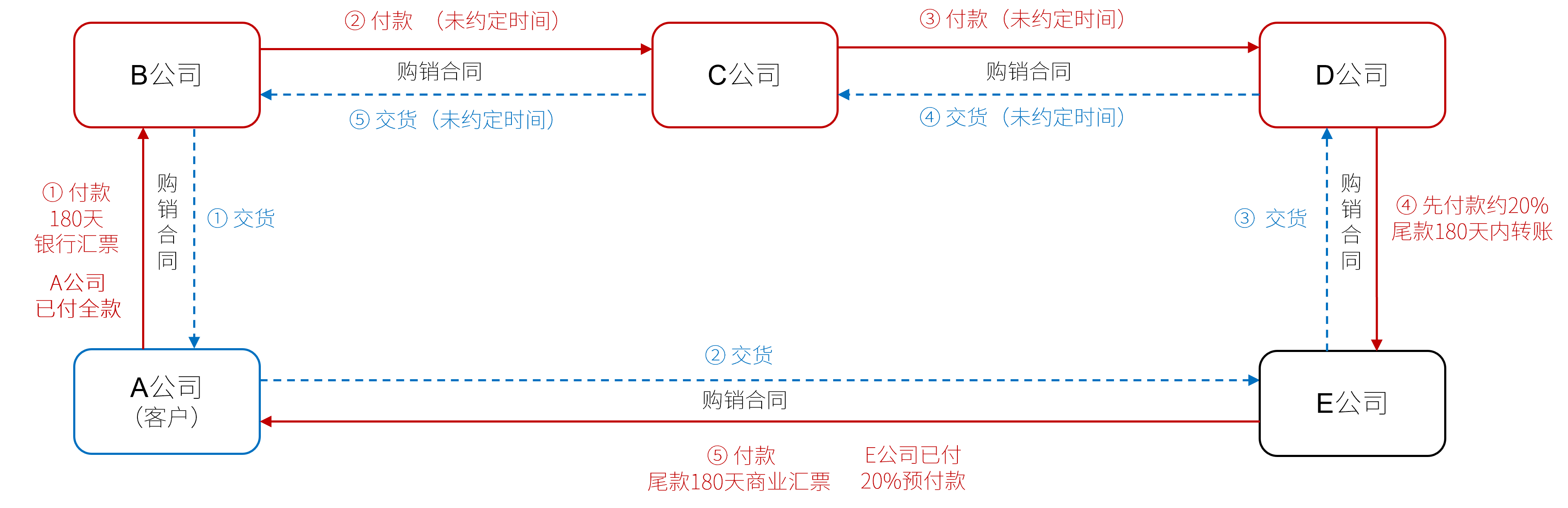 客户A公司,与B公司签订《购销合同》,约定A向B购货,签订合同当日以有效期180天的银行承兑汇票支付货款,A公司按约支付全额货款1.2亿元。B公司与C公司签订《购销合同》,约定B向C购货,未约定付款时间;C公司与D公司签订《购销合同》,约定C向D购货,未约定付款时间;D公司与E公司签订《购销合同》,约定D向E购货,签订当天支付约20%货款,180天内支付剩余80%货款;E公司与A公司签订《购销合同》,约定E向A购买与前述协议相同品种的货物,签订当天支付20%货款,并提供有效期180天的商业承兑汇票,以支付剩余80%货款。