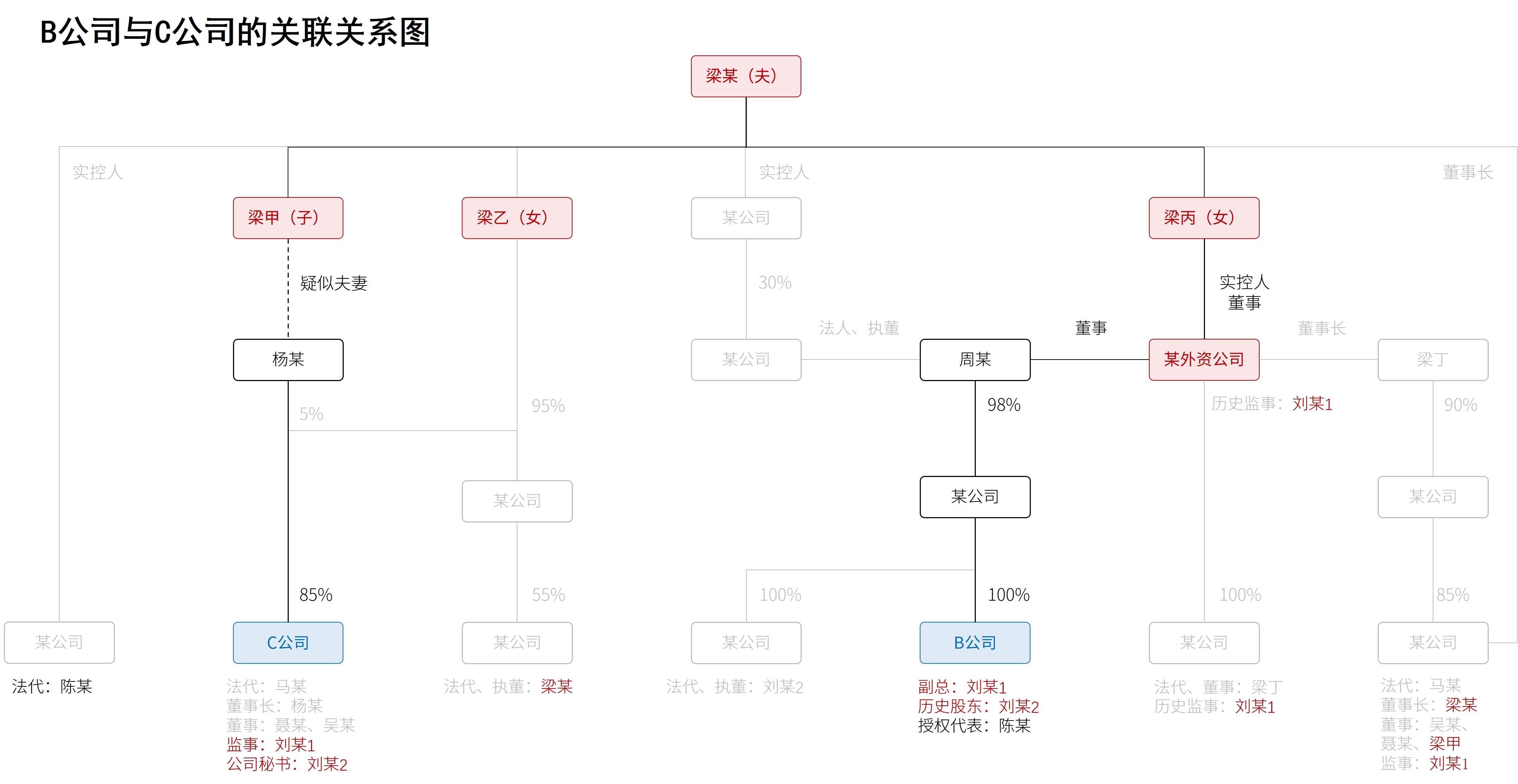 第一,梳理转让方和受让方的关系。我们从转让方和受让方的核心人物出发,以其股权、工作、亲属、交易等关系为网,通过工商内档、诉讼文书、社交媒体等公开渠道,逐一查询其关联企业、父母子女、配偶、姻亲、合作伙伴的相关情况。为此,我们全面而深入地调查了分布在全国各地数十家企业的合计上万页的工商内档,梳理各企业及其股东、高管的任职、持股、涉诉、媒体报道情况,并化繁为简,将繁杂的联系以可视化的方式展现(如下图所示)。