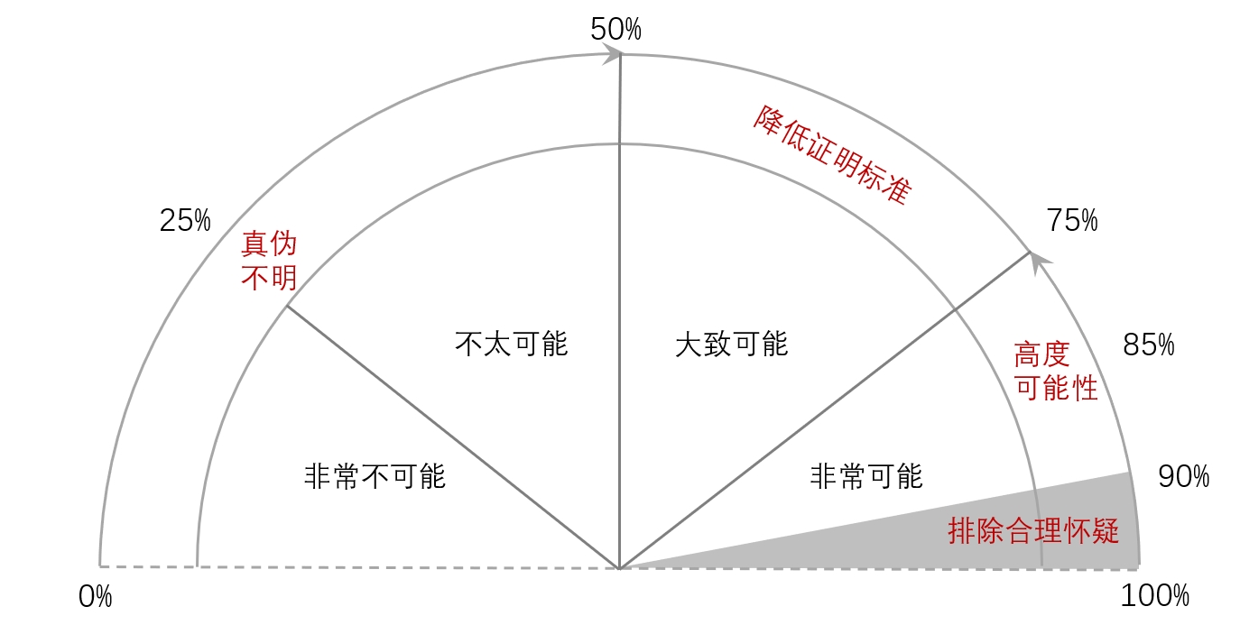 根据《最高人民法院关于适用<中华人民共和国民事诉讼法>的解释》(2022修正)第108条、第109条的规定[1],恶意串通的证明标准相较于一般的民事证据标准更高,如下图所示,对于一般的待证事实,法律只要求证明到高度盖然性,即量化大约75%-80%以上,而对于欺诈、恶意串通的证明标准,需要达到排除合理怀疑,即约90%-95%以上。该标准是我国刑事诉讼中认定案件事实所采用的证明标准,也直接被我国民事诉讼领域采纳为最高程度的一种证明标准,要求对案件事实不具有其他解释的可能性。