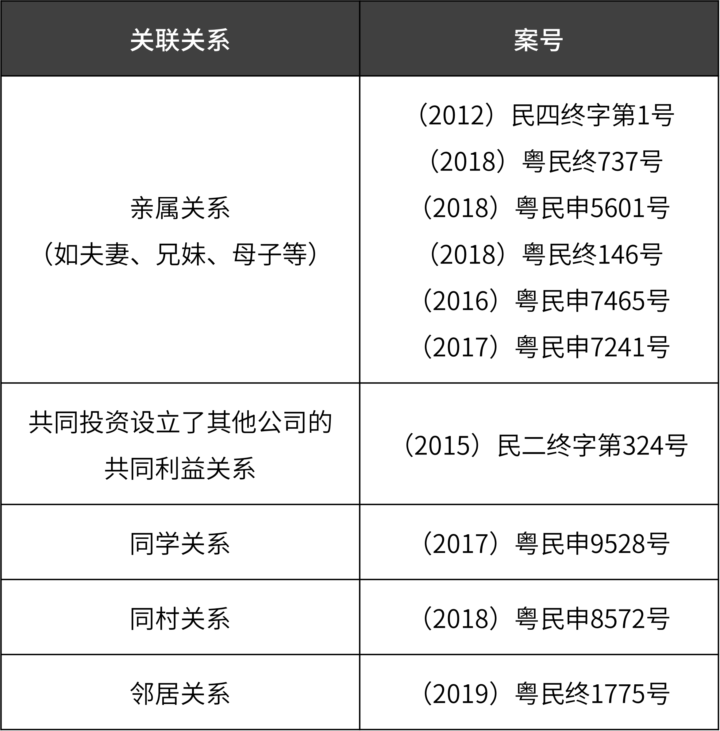 另外,我们通过梳理认定恶意串通的裁判案例,总结实务中足以认定“关系密切,具备恶意串通意思联络可能性”的当事人(自然人或公司的股东、实控人、董监高等)之间一般具有如下关系:
