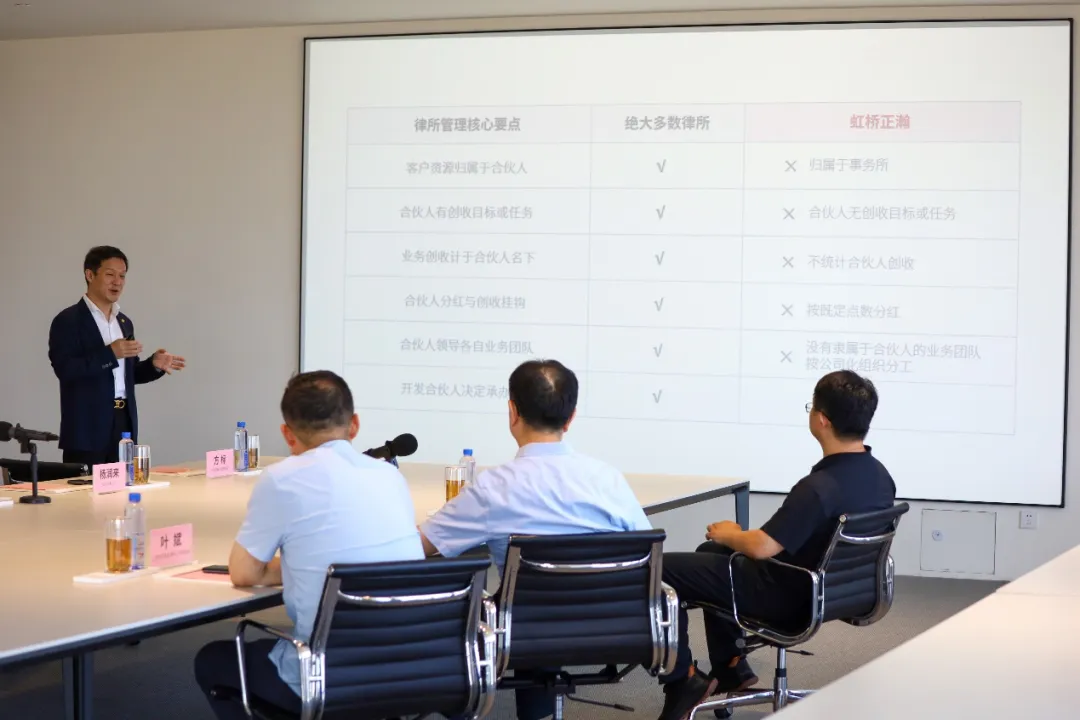 调研座谈会上,事务所主任杨润来律师围绕“公司化管理模式”和“聚焦争议解决业务”两个关键词,专题汇报了虹桥正瀚的历史情况、业务发展、战略定位、文化建设及未来发展规划。