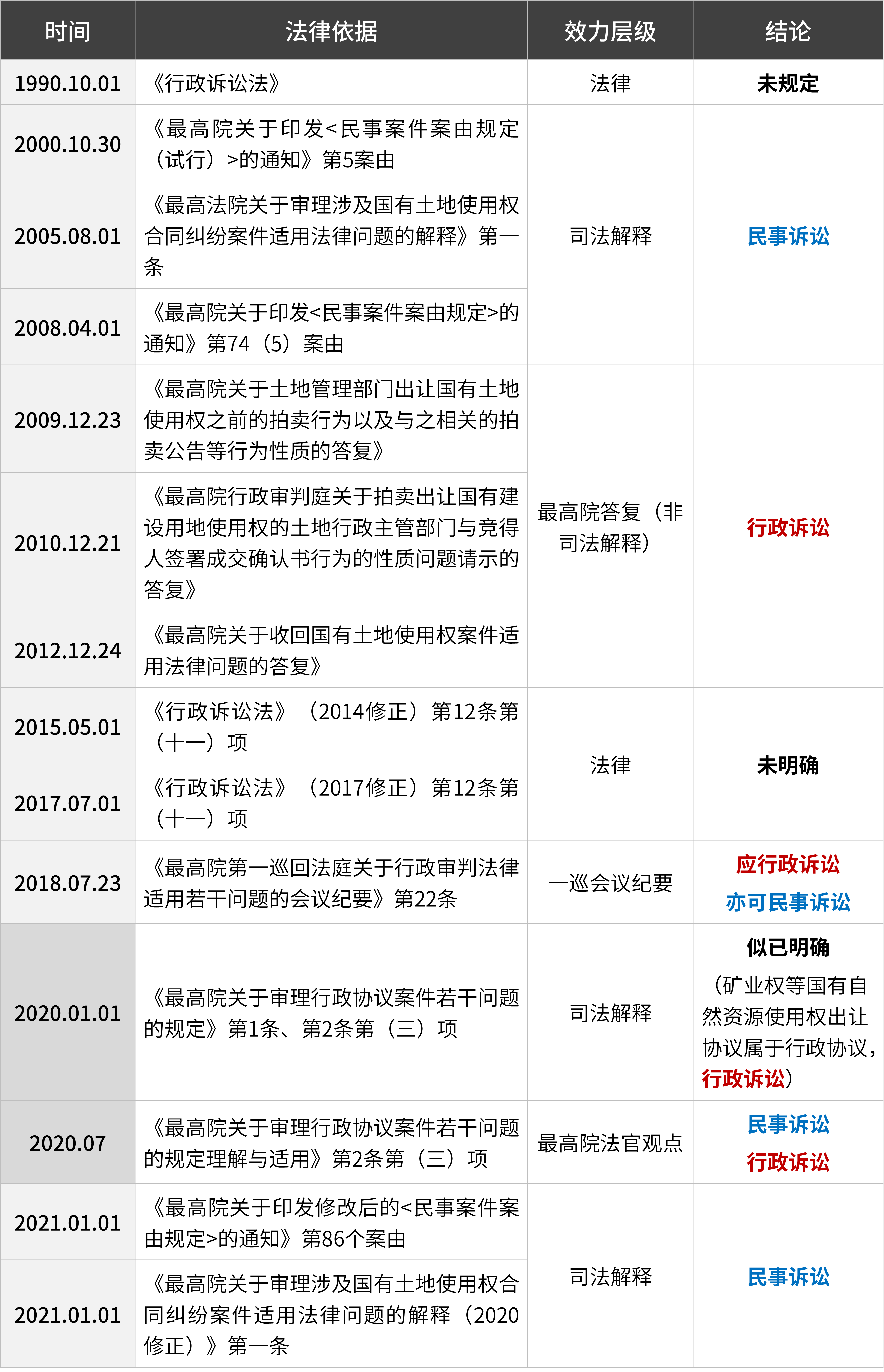 如下表所示,国有土地使用权出让合同纠纷,以及出让前招拍挂阶段发生的纠纷,究竟属于“民事诉讼”还是“行政诉讼”,无论是立法层面还是司法观点层面,已争论逾20年。
