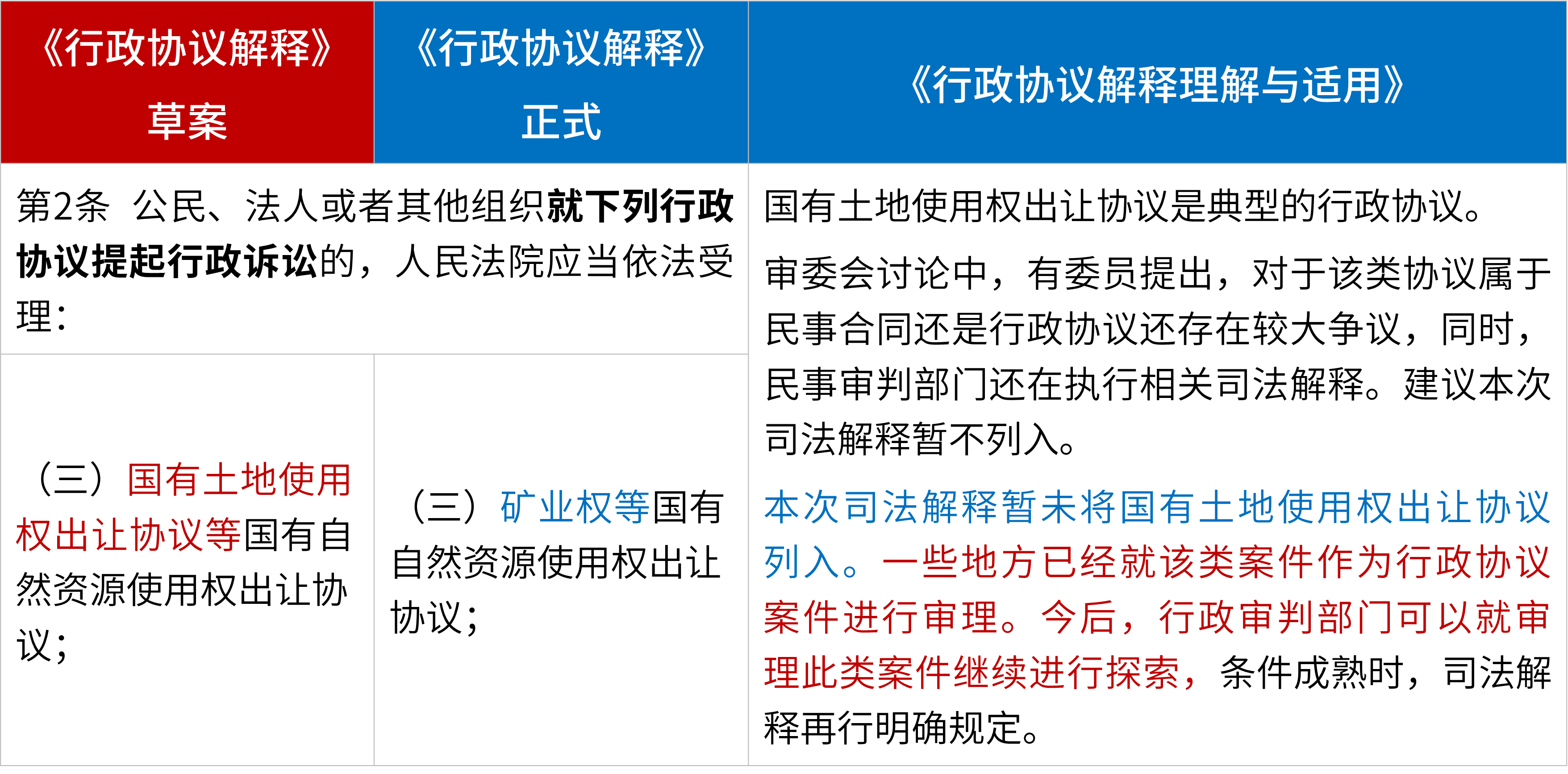 其次,《行政协议解释的理解与适用》将最终第二条第(三)项未采用起草时的表述的理由解释为,“在审委会讨论过程中,有的委员提出,对于该类协议属于民事合同还是行政协议还存在较大争议,同时,民事审判部门还在执行相关司法解释(我们理解应为:最高人民法院关于审理涉及国有土地使用权合同纠纷案件适用法律问题的解释等)。建议本次司法解释暂不列入。……”同时,《行政协议解释的理解与适用》在针对第二条的【实务指导】中又指出,“对于国有土地使用权出让协议的处理。本次司法解释暂未将国有土地使用权出让协议列入。一些地方已经就该类案件作为行政协议案件进行审理,积累了一些审判经验。今后,人民法院行政审判部门可以就审理此类案件继续进行探索,条件成熟时,司法解释再行明确规定。”