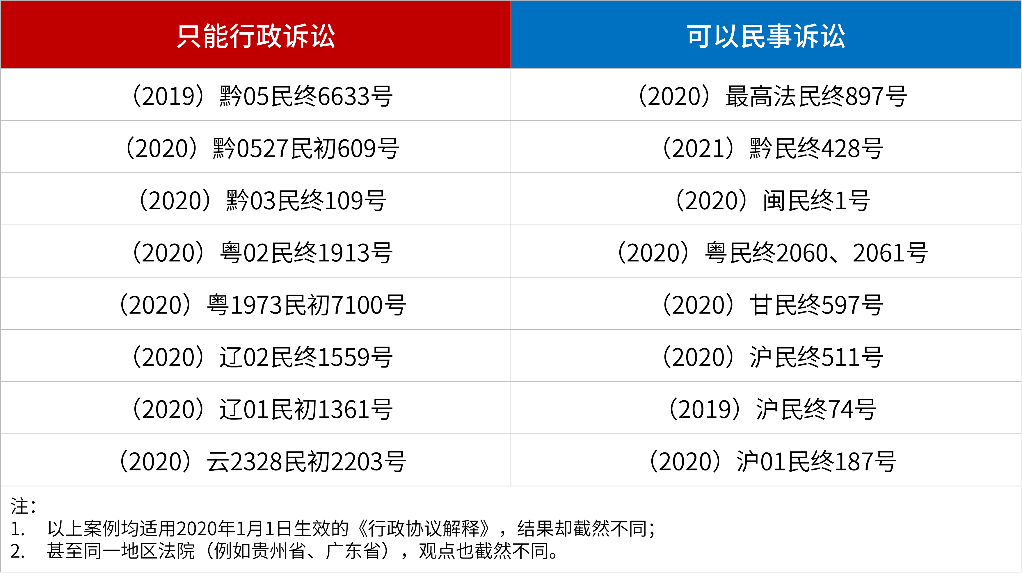 在过去二十年间,由于法律、司法解释等层面未能给出明确答案,而此类合同又兼具“行政行为”与“民事合同”的双重属性,法院立案庭在受理此类纠纷时,往往依据原告起诉状载明的内容,视具体主张选择性地作为“行政案件”或“民事案件”予以受理。然而,该等混乱甚至不会因为立案庭将案件分配至“行政审判庭”或“民事审判庭”而终止。