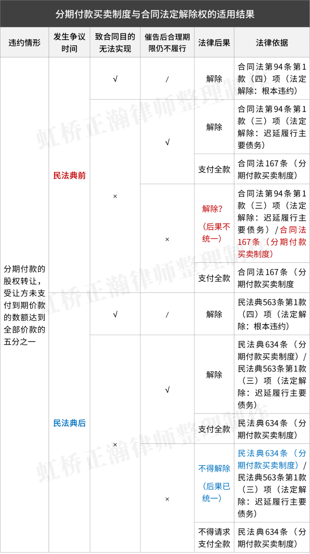 最高院指导案例67号并非否定分期付款买卖制度对股权转让交易的适用,而是认为在不符合根本违约或催告后仍不履行的法定解除条件时,不能简单适用原《合同法》第167条(无需催告即可解除)予以解除。但随着《民法典》第634条在原《合同法》第167条的基础上新增“催告程序”后,分期付款买卖制度的解除规定与合同法定解除权的规定趋于统一,法律适用的矛盾已消除。就该类争议的法律适用问题可总结如下表所示: