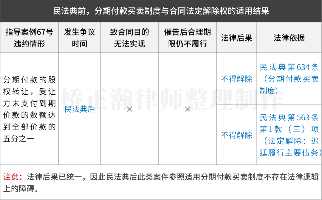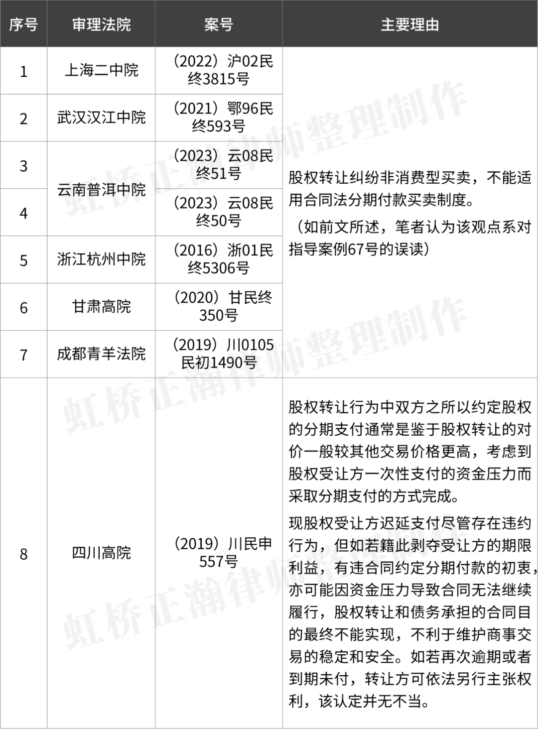 三、最高院指导案例67号未支持适用分期付款买卖制度解除股权转让合同,系因该案不符合法定解除条件,并非制度本身不能参照适用