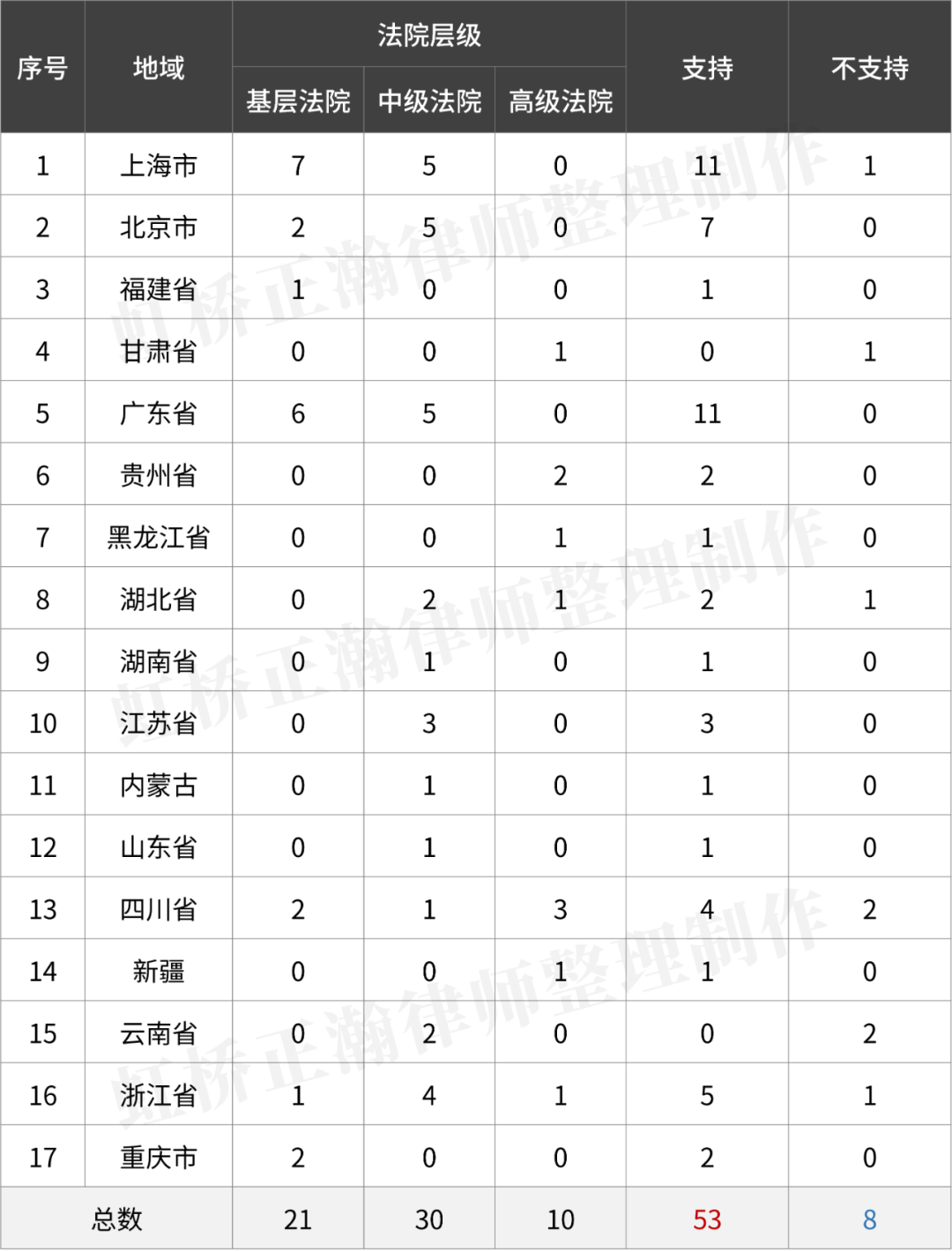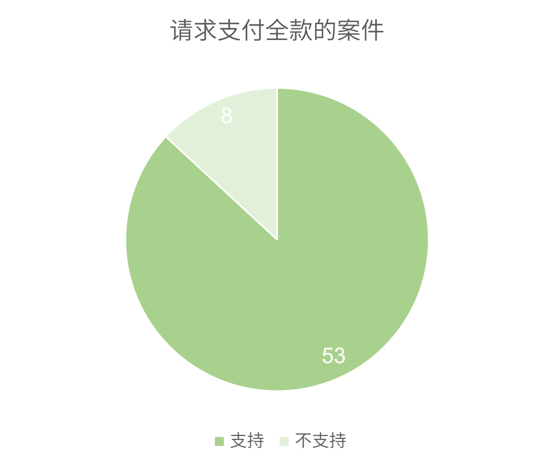 61个请求支付全款的司法判例,其中支持支付全款的案件达53个,占总数的86.9%;不支持支付全款的案件有8个,占总数的13.1%。