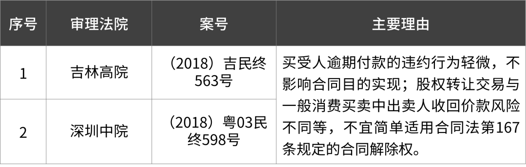 以上分析可知,2个不支持解除合同的案件均产生于民法典生效前,受让方均未达到原《合同法》第94条法定解除的条件,既未达到根本违约的条件,也未经催告程序就请求解除。此时,如果适用原《合同法》第167条分期付款买卖制度的解除权就简单解除,将导致法律适用上的矛盾。反观唯一支持解除合同的(2019)琼97民初7号案件,“涉案股权现已转让给案外人吉林和信公司,并已完成工商变更登记,涉案的《股权转让协议》事实上已不可能继续履行,故涉案的《股权转让协议》亦应解除”。可见,法院是基于合同目的已无法实现(根本违约)而支持解除合同,符合原《合同法》第94条法定解除条件。