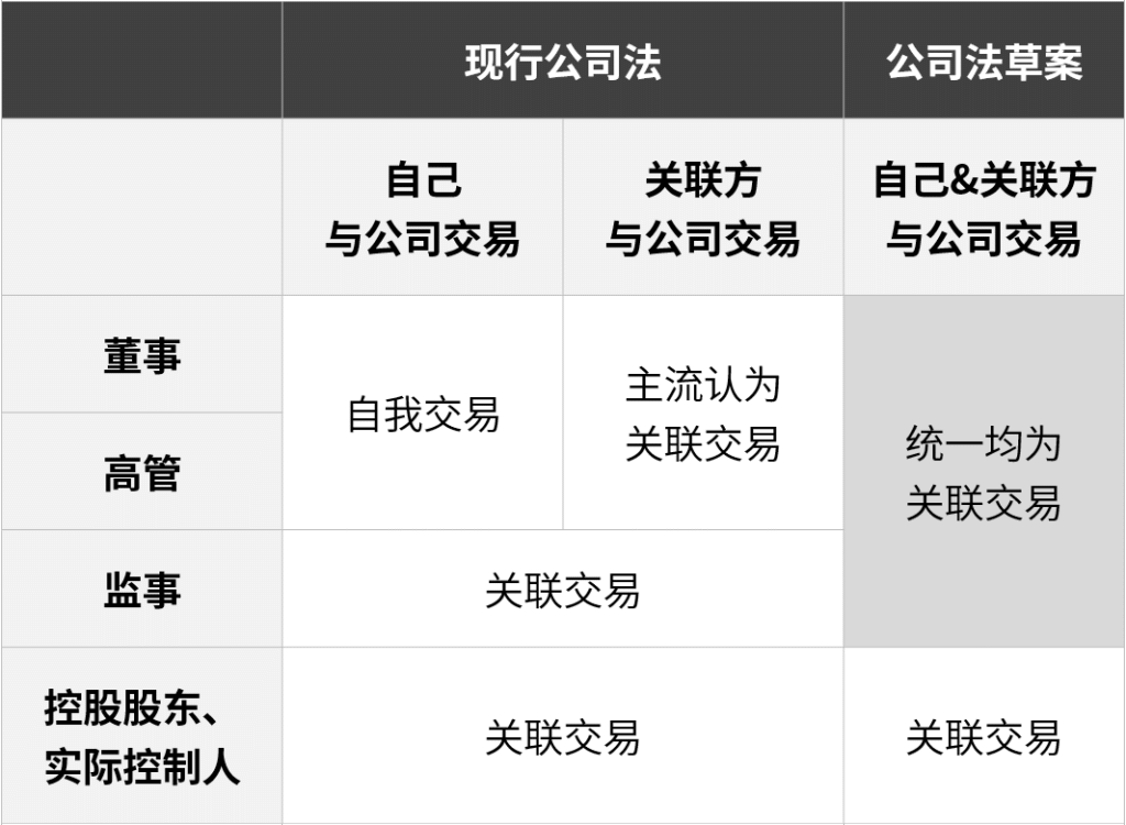 本次《公司法草案》对董事、监事、高管与公司的关联交易、自我交易做了统一的规范调整,第183条规定:“董事、监事、高级管理人员,直接或者间接与本公司订立合同或者进行交易,应当就与订立合同或者进行交易有关的事项向董事会或者股东会报告,并按照公司章程的规定经董事会或者股东会决议。董事会决议时,关联董事不得参与表决,其表决权不计入表决权总数。董事、监事、高级管理人员的近亲属,董事、监事、高级管理人员或者其近亲属直接或者间接控制的企业,以及与董事、监事、高级管理人员有其他关联关系的关联人,与公司订立合同或者进行交易,适用前款规定。”从前款规定可以看出,草案不再特别区分董事、高管个人与公司的自我交易,而是将其统一纳入了董事、监事、高管关联交易的大范畴。