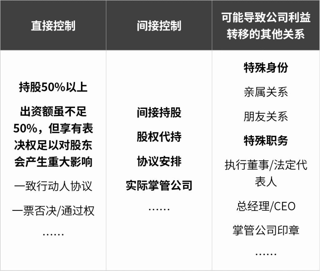 关于关联方的认定,现行《公司法》定义为控股股东、实际控制人、董事、监事、高级管理人员直接或间接控制的企业,以及具有可能导致公司利益转移关系的主体。值得关注的是,本次《公司法草案》第183条首次将董事、监事、高级管理人员的近亲属及其直接或间接控制的企业纳入了关联方的范畴,进一步扩大了关联交易的规范范围。至此,控股股东、实际控制人、董事、监事、高级管理人员的关联方主要呈现如下几种形式: