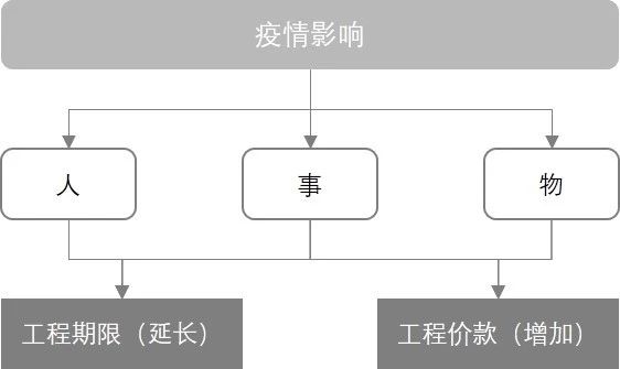 在上述“人”、“事”、“物”三个方面的影响下,最终体现于建设工程的核心要素“工程期限”和“工程价款”。对于工程期限的影响,即建设工程可能无法按原定竣工日期按时竣工,工程期限需作延长;对于工程价款的影响,即原定的建设工程价款可能无法覆盖因疫情而增加的成本及损失,故而调整工程价款等。