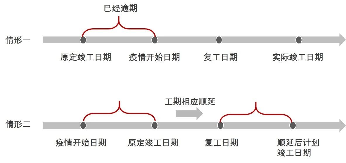 需要特别注意的是,第一,工期顺延所产生的后果仅为建设单位将不因竣工延期而追究施工单位的逾期违约责任,而对于因此产生的其他损失,仍应由双方根据施工合同约定分担。第二,建设单位仅免除施工单位因不可抗力导致工期延误而产生的违约责任,例如下图所示,在情形一的情况下,在疫情开始日期前,已经构成逾期的,则施工单位仍需承担逾期竣工的违约责任;而在情形二的情况下,原定竣工日期到来前,疫情已经开始并影响工期,则疫情开始日期至原定竣工日期间的工期相应顺延,在顺延后的工期内竣工的,施工单位无需承担逾期违约责任。第三,施工单位申请工期顺延应严格履行施工合同约定的审批程序,例如《17版示范文本》通用条款第19.2款对于施工单位应履行通知义务并提供相关证明材料等程序的详细约定。第四,不可抗力并非施工单位的“尚方宝剑”,不可抗力发生后,各方均应采取措施尽量避免和减少损失的扩大,任何一方当事人没有采取有效措施导致损失扩大的,应对扩大的损失承担责任。第五,在具备复工条件后,建设单位与施工单位一般应通过签署补充协议、签证等形式对顺延的工期进行确认,以免结算时产生分歧。