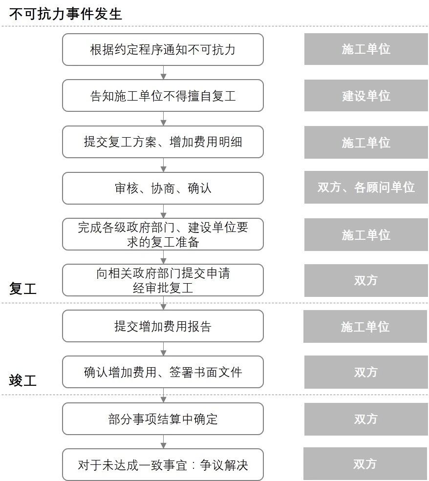 如施工单位在进行不可抗力通知时同步提出损失应由建设单位承担的,建设单位应要求施工单位对费用增加事项提供详细的名目和预估金额,然后应组织工程监理、投资监理等顾问单位对详细名目中的各项费用、损失名目进行责任主体的确认;如部分费用、损失的责任承担主体并未在施工合同中明确约定的,则建议双方友好协商、公平分担。在不可抗力事件的影响结束后,施工单位应提交费用增加的具体金额及各项明细,由双方根据施工合同约定的程序进行确认和结算。
