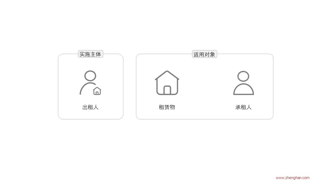 在租金减免政策中,作为租赁关系主体之一的出租人被称为“实施主体”,而另一租赁关系主体承租人与客体租赁物则被统称为“适用对象”。只有当实施主体和适用对象均符合租金减免政策要求的情况下,这个租赁关系才能适用政策。