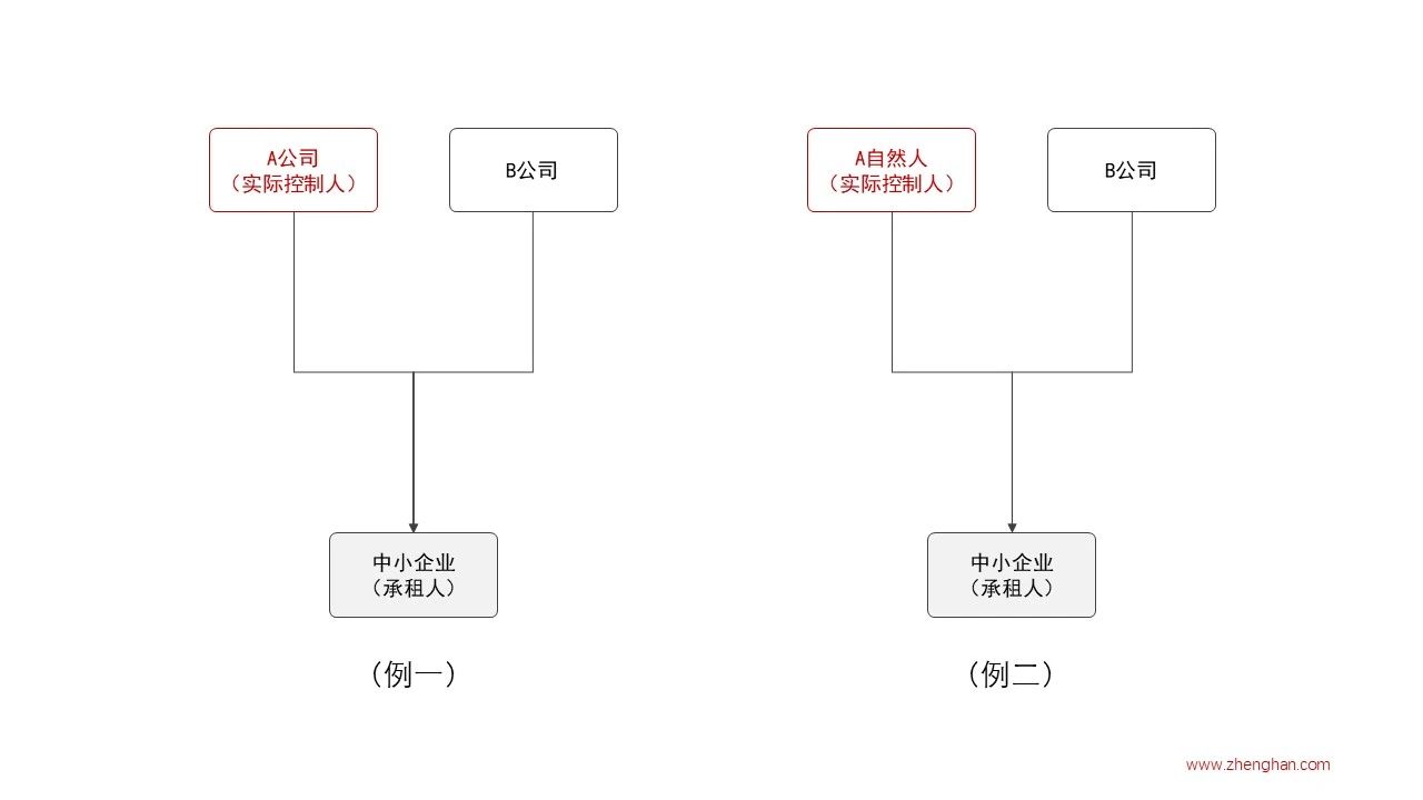 上面我们完整讲述了判断企业是否为中小企业的具体方法,但我们并没有讲到判断对象,是否判断承租人本身即可?实践中,由于类似大型企业集团下属的子企业作为承租人的情况不在少数,为了规避这类形式上符合中小企业条件,实质上并不符合中小企业条件的承租人享受减免政策,而违背政策初衷。我们在判断中小企业这一条件时不能简单地对承租人本身进行认定,应当通过“穿透”原则判断承租人背后的实际控制人是否符合。我们通过下面两个例子来解释一下“穿透”原则的具体操作方法。