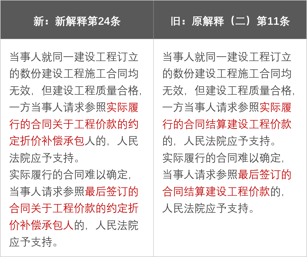 综上所述,虽然本次解释主要系对原规定的整体梳理、延续和更新,但其本质上并不纯粹是“合二为一”。除部分内容配合《民法典》作体系性调整外,以上视角中的亮点仍然反映出最高院对于建设工程施工合同司法实务的一些最新理念,值得我们进一步延伸思考。