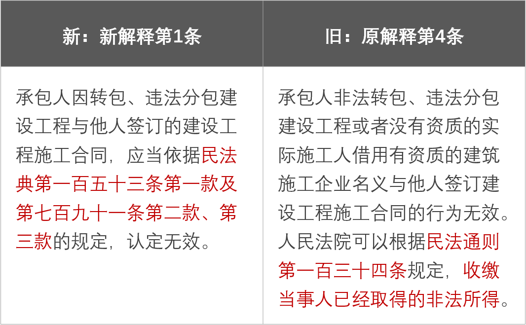 本条主要变化在于在承包人违法转包、分包签订施工合同情形下,删除了法院收缴当事人非法所得的规定。