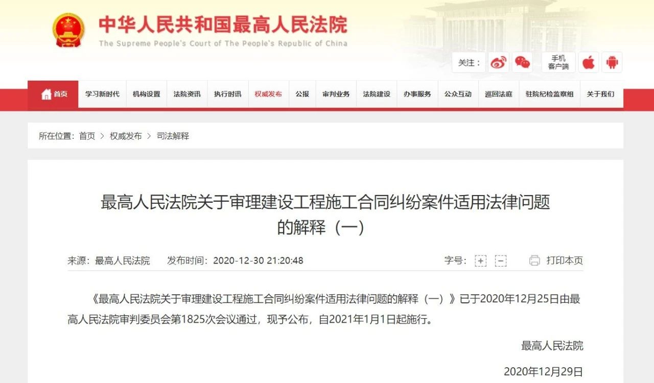 2020年12月29日,最高人民法院发布了《最高人民法院关于审理建设工程施工合同纠纷案件适用法律问题的解释(一)》(以下简称“本次解释”),本次解释已于2021年1月1日起正式施行。
