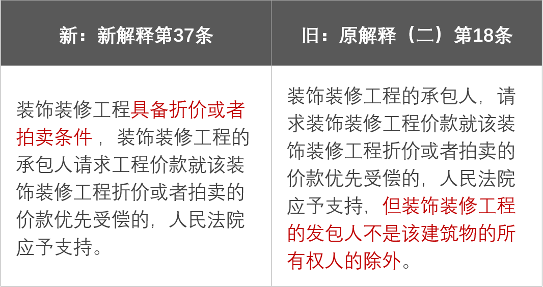 本次解释在沿袭该条规定的基础上,改变了装饰装修工程承包人行使优先受偿权的条件,删去了“发包人不是该建筑物的所有权人的除外”,增加了“装饰装修工程具备折价或拍卖条件”。