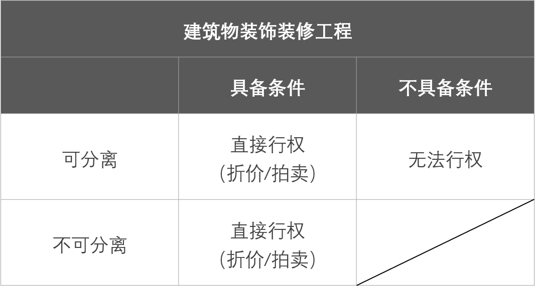 在本次解释中,不再对“发包人是建筑物的所有权人”这一前提条件进行限制,而仅要求“装饰装修工程具备折价或者拍卖条件”,这意味着在一定的情况下,承包人可以对于“非所有权人”的发包人主张优先受偿权,增强了对于承包人的保护力度。就装饰装修工程承包人主张优先受偿权的方式,根据装饰装修工程能否从建筑物中分离,可以分为如下二种: