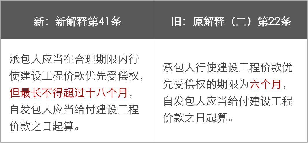 对于优先受偿权的行使期限,本次解释在原《建设工程司法解释(二)》的基础上,从发包人应当给付建设工程价款之日起六个月内修改为了“合理期限”,但上限为“发包人应当给付建设工程价款之日起十八个月内”,大大延长了优先受偿权的行权期限,加大对承包人的保护力度。