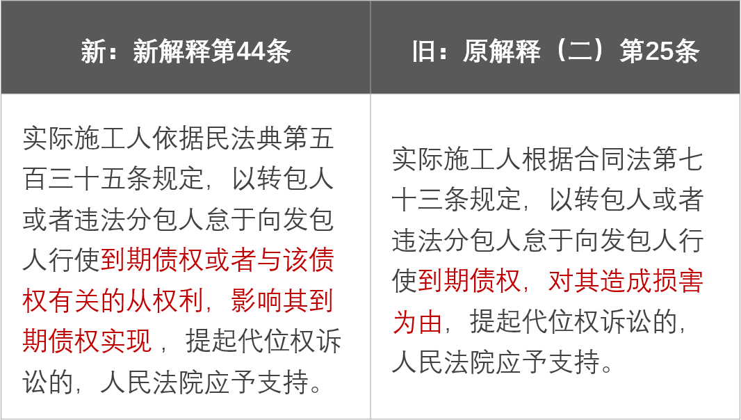 根据《民法典》第535条“债权人代位权”的相应调整,本次解释对于实际施工人所享有的代位权也进行了体系性的调整。主要改动体现在如下二方面: