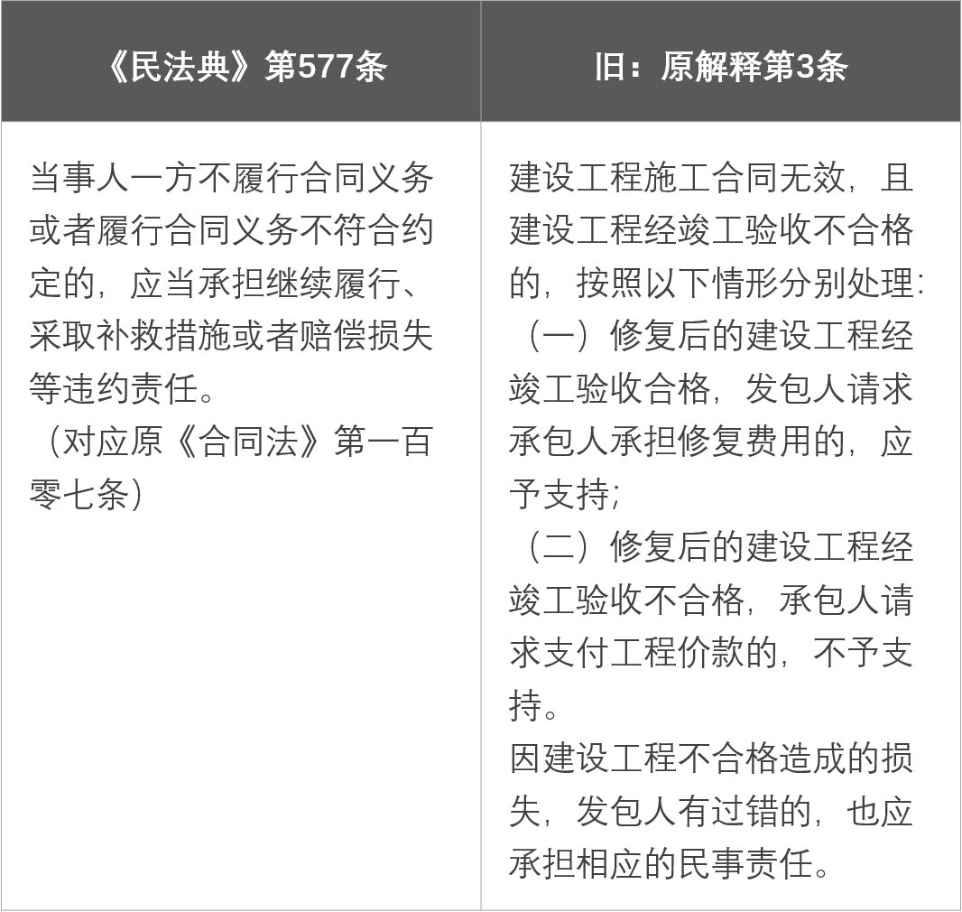 《民法典》第577条为违约责任条款,即在建设工程质量不合格的情形下,承包人应当承担违约责任。本次解释规定回归了法律常规处理方式,且原条款“参照无效合同的处理原则”的做法本质上就是使承包人承担补救或赔偿损失的违约责任。