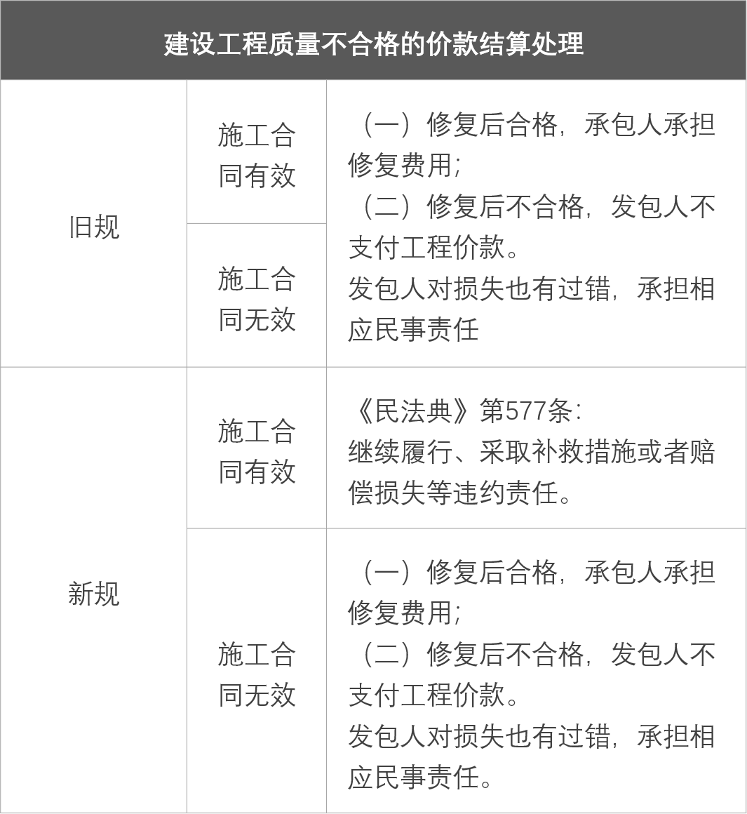 本条第三款规定了在施工合同有效,但建设工程不合格情形下的处理方式。主要变化有二:(1)删去了“工程价款结算”;(2)法律依据由原《建设工程司法解释》第3条变为《民法典》第577条。