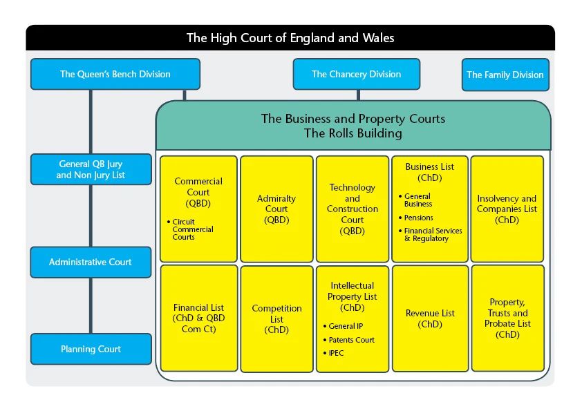 “金融清单制度”无法直接与中国内地法项下的任何概念予以直接对应。英国法院官网(Court and Tribunals Judiciary)对金融清单制度作出如下描述:“金融清单是为解决参与金融诉讼当事人的特定需求而设立的一个跨司法管辖区的专业清单(The Financial List is a specialist cross-jurisdictional list set up to address the particular business needs of parties litigating on financial matters.)”。结合其官网的所提供的法院结构图,我们理解,金融清单制度本质更像是:法院针对审理需要高度专业性金融案件所下设的特别审判庭,由特定的专业法官(Financial List judge)审理该类金融案件。