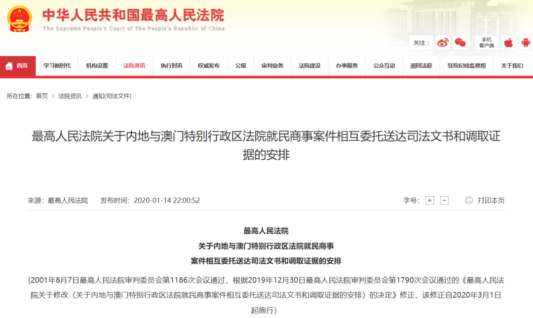 2022年2月24日,最高院公布《最高人民法院关于内地与澳门特别行政区就仲裁程序相互协助保全的安排》(法释〔2022〕7号),将于2022年3月25日生效。根据该安排,保全范围在内地包括财产保全、证据保全、行为保全,在澳门包括为确保受威胁的权利得以实现而采取的保存或者预行措施。按照澳门仲裁法规向澳门仲裁机构提起民商事仲裁程序的当事人,可以向有管辖权的内地中级人民法院申请保全;依据《中华人民共和国仲裁法》向内地仲裁机构提起民商事仲裁程序的当事人,亦可以向澳门特别行政区初级法院申请保全。