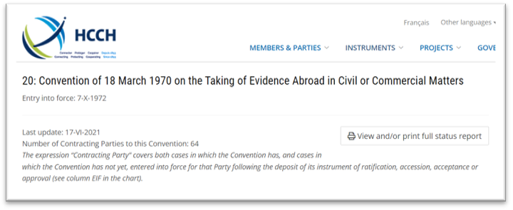 根据我国加入的《关于从国外调取民事或商事证据的公约》(Convention of 18March 1970 on the Taking of Evidence Abroad in Civil or Commercial Matters,下称“《海牙取证公约》”)(现成员国64个⁵),成员国可以依公约开展证据调取的司法协助。