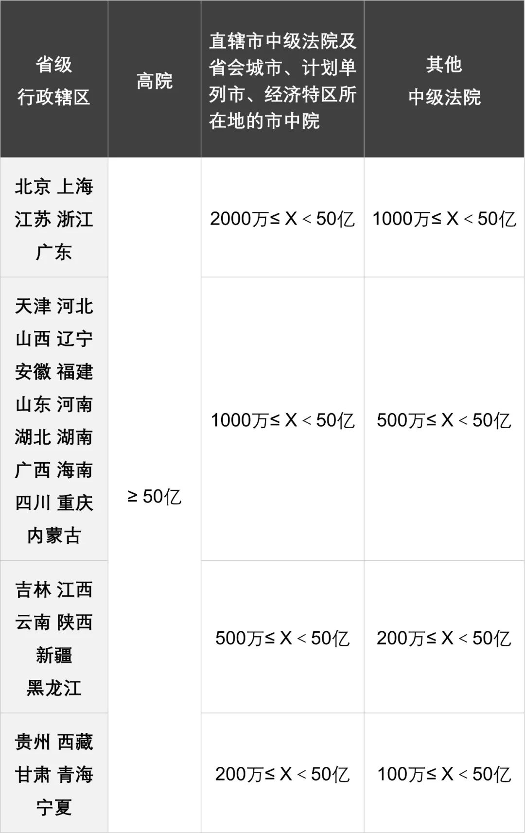 据此,结合法[2017]359号文与法发[2019]14号文,我们就涉外民商事案件一审的级别管辖标准梳理如下(X代表诉讼标的金额,本文全部货币单位为人民币元):