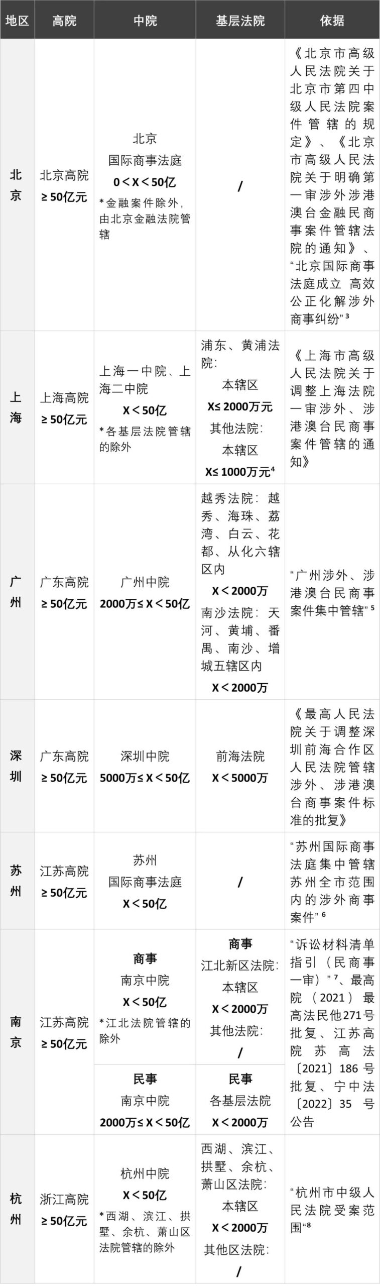 除此外,结合法[2017]359号文实施后最高院对各地关于级别管辖的批复,以及各地关于集中管辖的规定,我们根据公开渠道检索到的规定及官方新闻,梳理北上广深等地区一审涉外民商事案件的一审级别管辖速查表如下。欢迎各位读者伙伴补充当地的管辖情况: