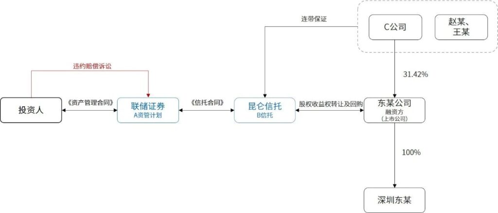 2017年1月,联储证券有限责任公司(“联储证券”)设立A集合资管计划(“A资管计划”),投资标的是昆仑信托有限责任公司(“昆仑信托”)作为受托人设立的B单一资金信托(“B信托”),昆仑信托代表B信托以信托资金受让东某公司持有的其子公司深圳东某公司(“目标公司”)100%股权(“标的股权”)的收益权,投资期限为两年,东某公司承诺到期按照约定的回购价款回购标的股权收益权,回购价款由转让价款及行权费组成,行权费应于每个会计年度的6月20日及12月20日前结清。东某公司的股东C公司、赵某、王某就东某公司的回购义务向昆仑信托承担连带保证责任。