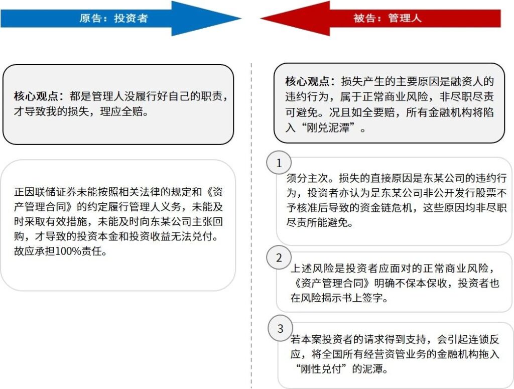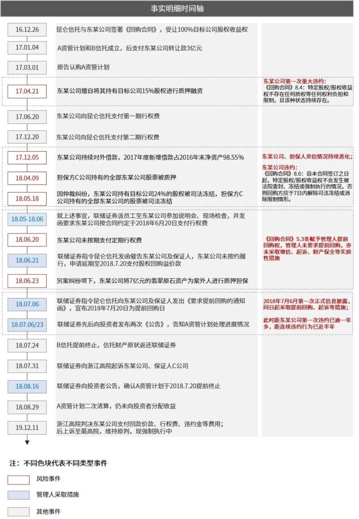 “东某公司和保证人多次违反《回购合同》约定,主要涉及:东某公司将其持有的深圳东某公司15%的股权进行质押融资;东某公司持有的深圳东某公司24%的股权被司法冻结;东某公司2017年累计新增借款超过2016年末净资产的20%;东某公司持续提供担保;东某公司涉及众多诉讼、资产被查封、扣押和冻结;担保人担保能力下降,明显违反了其在《回购合同》中的陈述和保证条款。联储证券是专业金融投资机构,在涉案资管计划的风险控制上应当尽到专业审慎的注意义务,但该公司对上述事项却没有及时披露和控制相应的风险,亦未采取积极有效的措施的促使《回购合同》项下的义务得以履行,维护投资者在《资管合同》项下的合法利益,存在一定违约行为。”