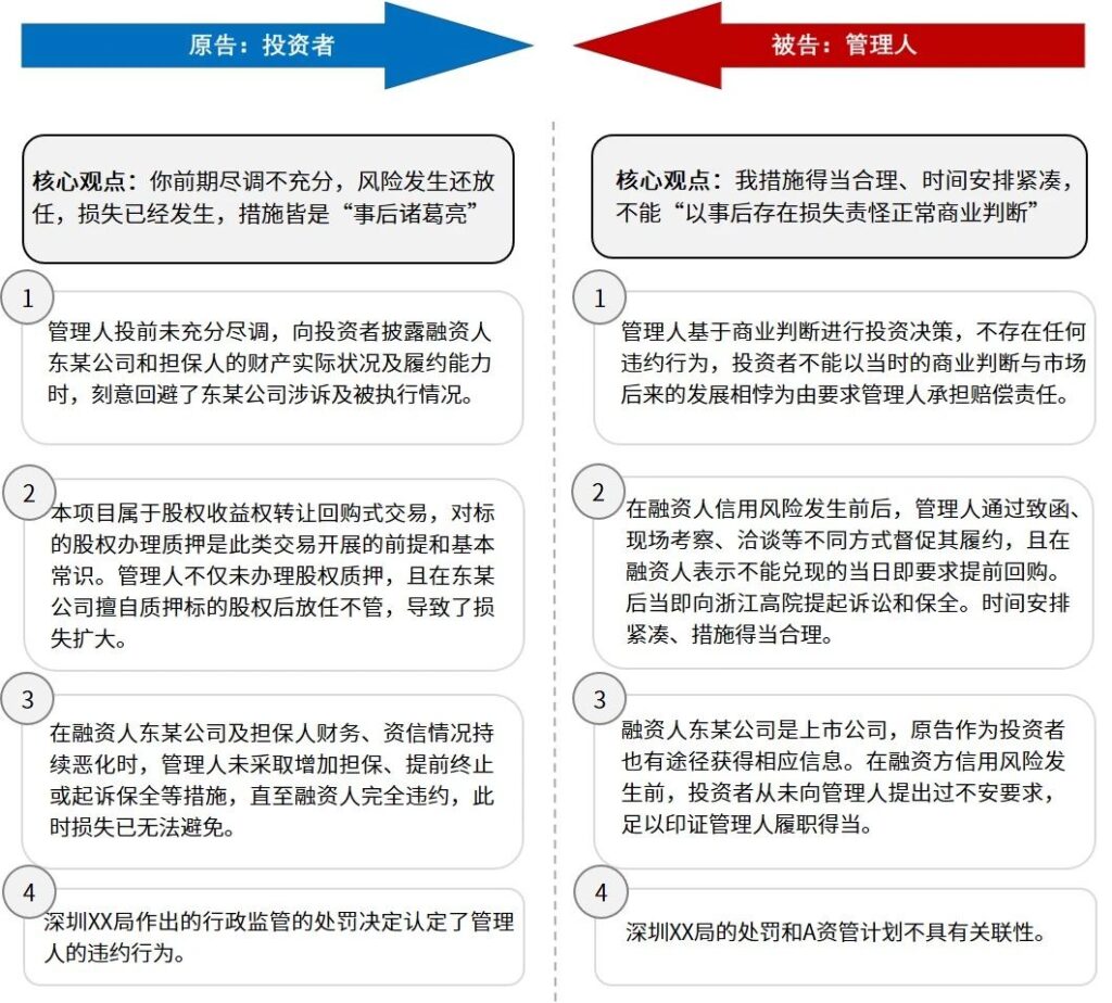 本案中,监管机构向管理人出具《行政监管措施决定书》,其中载明管理人存在信息披露不及时、合同条款缺失、资管业务内部控制不到位、部分投资比例超标等违规行为,法院在裁判中亦参考了相关行政处罚文件。实践中,由于信息的不对称性,投资者往往难以掌握内部材料,客观上导致举证困难。投资人可考虑在提起民事诉讼之前,主动向监管机构进行行政举报并提供相关违法违规线索,若获取有利文书,则有助于举证管理人失职行为,进而获得司法上的有利“定性”;对于管理人而言,则可通过投资人提交的行政监管材料与资产管理产品缺少关联性为由提出抗辩。